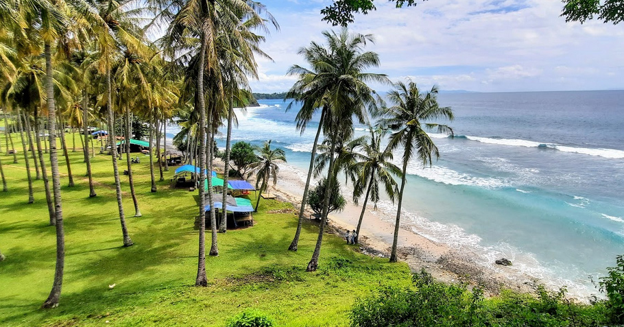 Bagi pemburu konten media sosial, batang-batang pohon kelapa yang melengkung ke arah laut dan garis pantai yang sepi adalah dekorasi alami yang luar biasa untuk sesi foto pre-wedding maupun outfit of the day (OOTD).